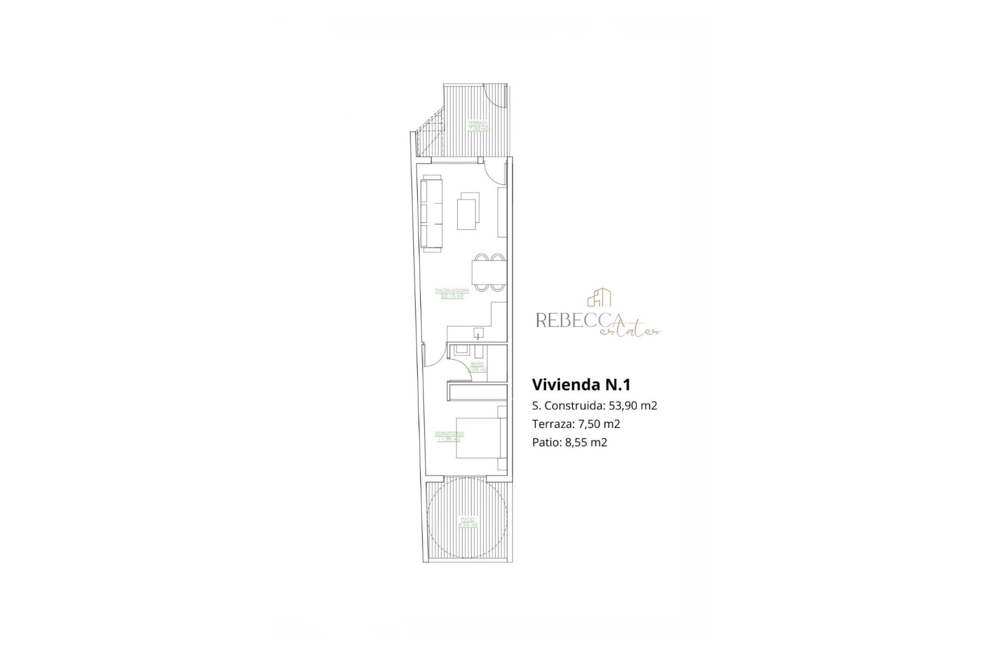 Der offen gestaltete Wohn- und Essbereich bietet direkten Zugang zu einer 7,5 m² großen Terrasse. Vom Schlafzimmer aus gelangen Sie auf Ihren Patio von 8,5 qm Größe.